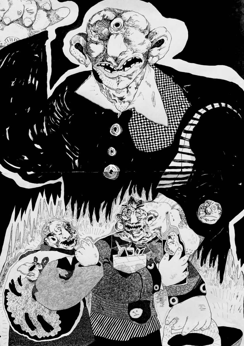 George Spencer Jackson is a talented drawer and was awarded the Hermione Hammond award in 2019. His ink drawings are a raw reflection of working-class people. The ink has a definitive quality that George manipulates with unparalleled confidence. So far he has taken inspiration from those of a lower income environment and the narratives that can develop from those situations.